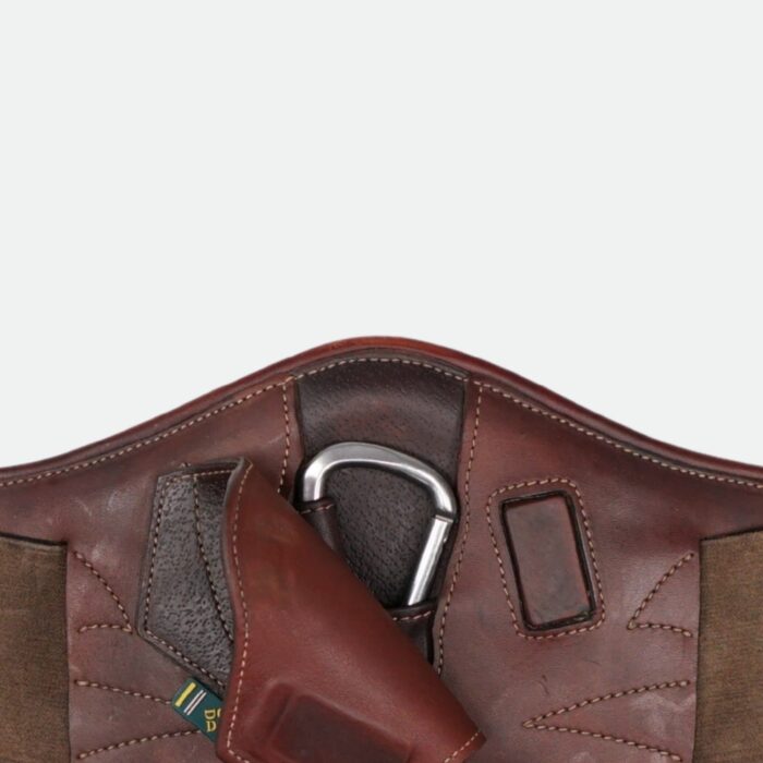 - La sangle cross mousqueton offre une bavette anatomique dégageant les coudes du cheval pour les selles avec sanglage bas.