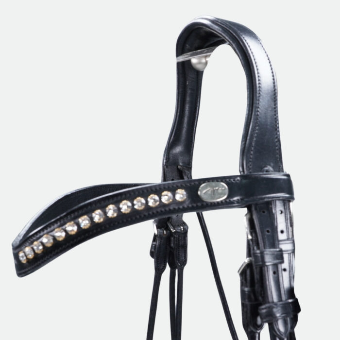 Cuir rond de haute qualité : Fabriquée en cuir anglais pleine fleur, cette bride allie durabilité et souplesse pour un confort optimal du cheval.