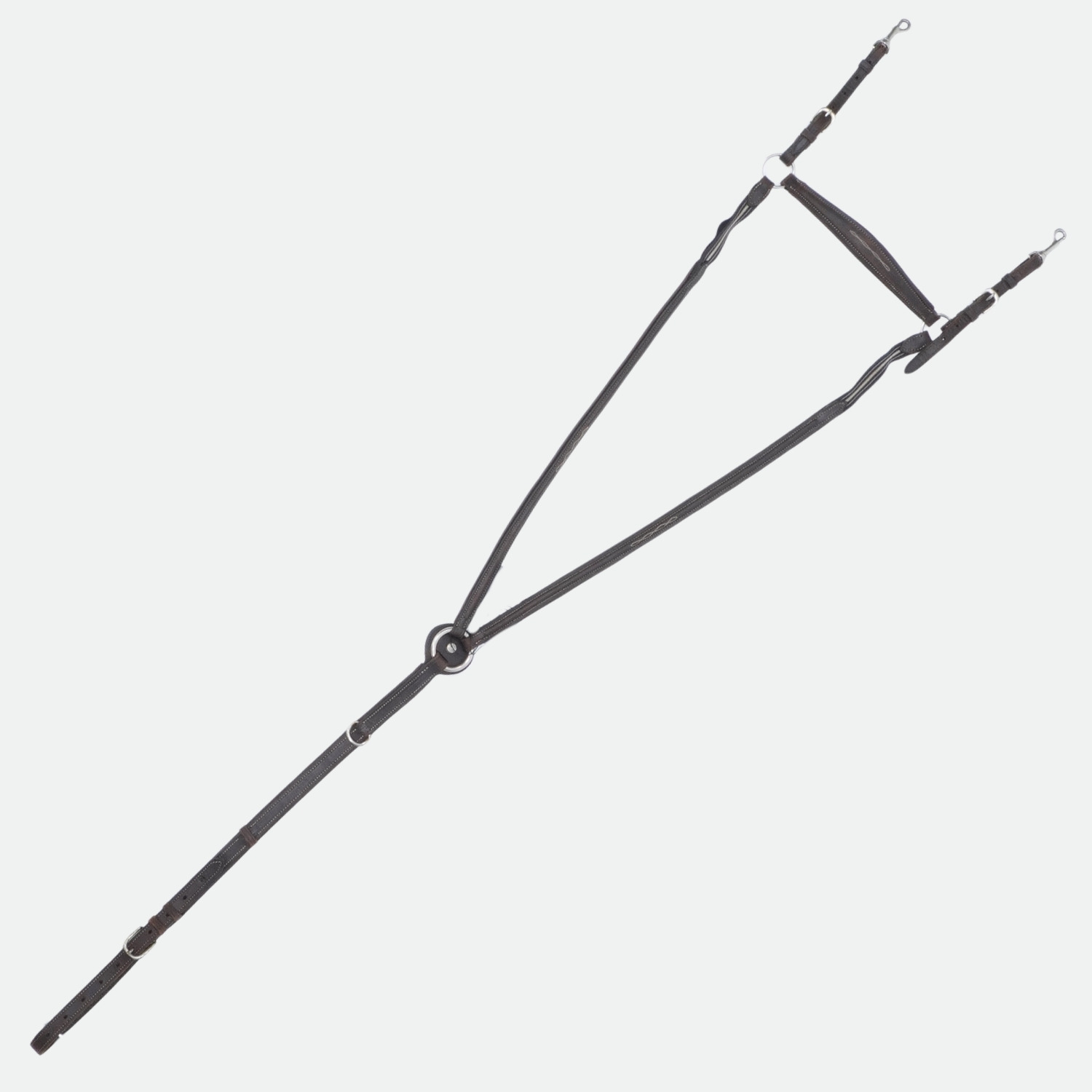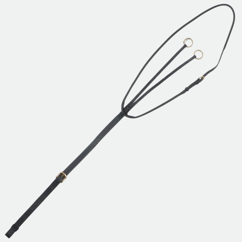 Fixation via mousquetons inox sur la sangle et la selle, avec anneaux pour rattacher une fourche de martingale.
