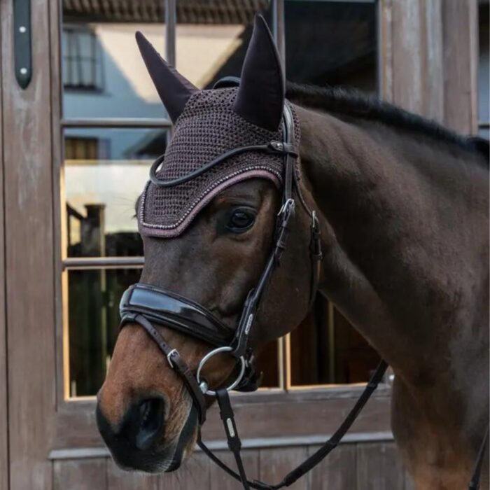 - Bonnet anti-mouches en coton hypoallergénique et antibactérien, doté de la technologie Soundless au niveau des oreilles et d’une lanière pour fixer à la têtière. Idéal pour les chevaux sensibles au bruit.