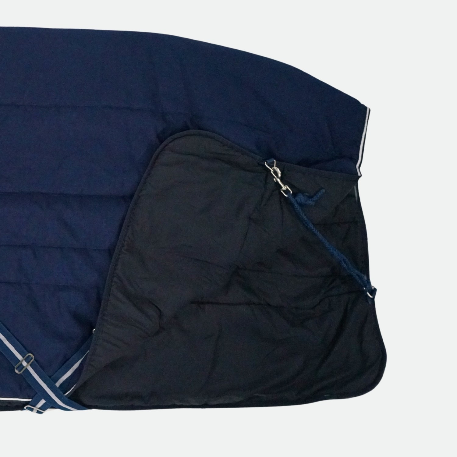 Sur-sangles croisées et courroies de cuisse, pour un bon maintien de la couverture au box.