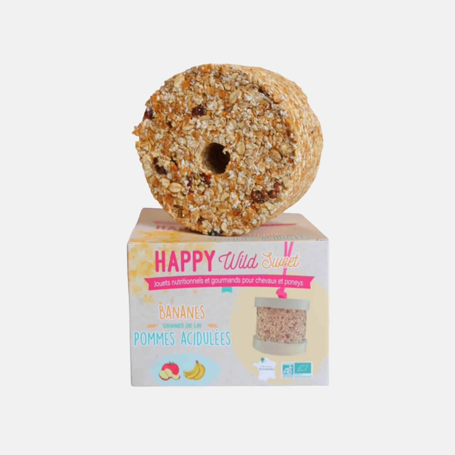 Le Happy Wild Sweet de Happy Crackers est un jouet gourmand bio à suspendre, élaboré à partir de pommes et de bananes issues de l’agriculture biologique. Il offre au cheval un moment de plaisir naturel tout en répondant à son besoin instinctif de lécher, ronger et mastiquer.