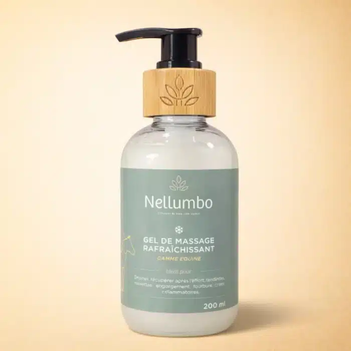 Le gel de massage rafraîchissant Nellumbo est un soin externe conçu pour accompagner la récupération du cheval après l’effort. Sa texture fraîche et légère permet un massage confortable des membres, muscles et articulations sollicités lors du travail, de l’entraînement ou en période de concours.